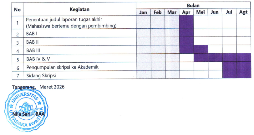 Pengumpulan dokumen paling lambat 30 Juni 2026. - Mahasiswa melakukan pembayaran Biaya Skripsi sebesar Rp. 2.200.000 (Dua Juta Dua Ratus Ribu Rupiah) ke Bagian Keuangan, biaya tersebut sudah termasuk biaya sidang skripsi dan yudisum dan akan mendapatkan Formulir Pengajuan Judul Skripsi dari Bagian Keuangan.